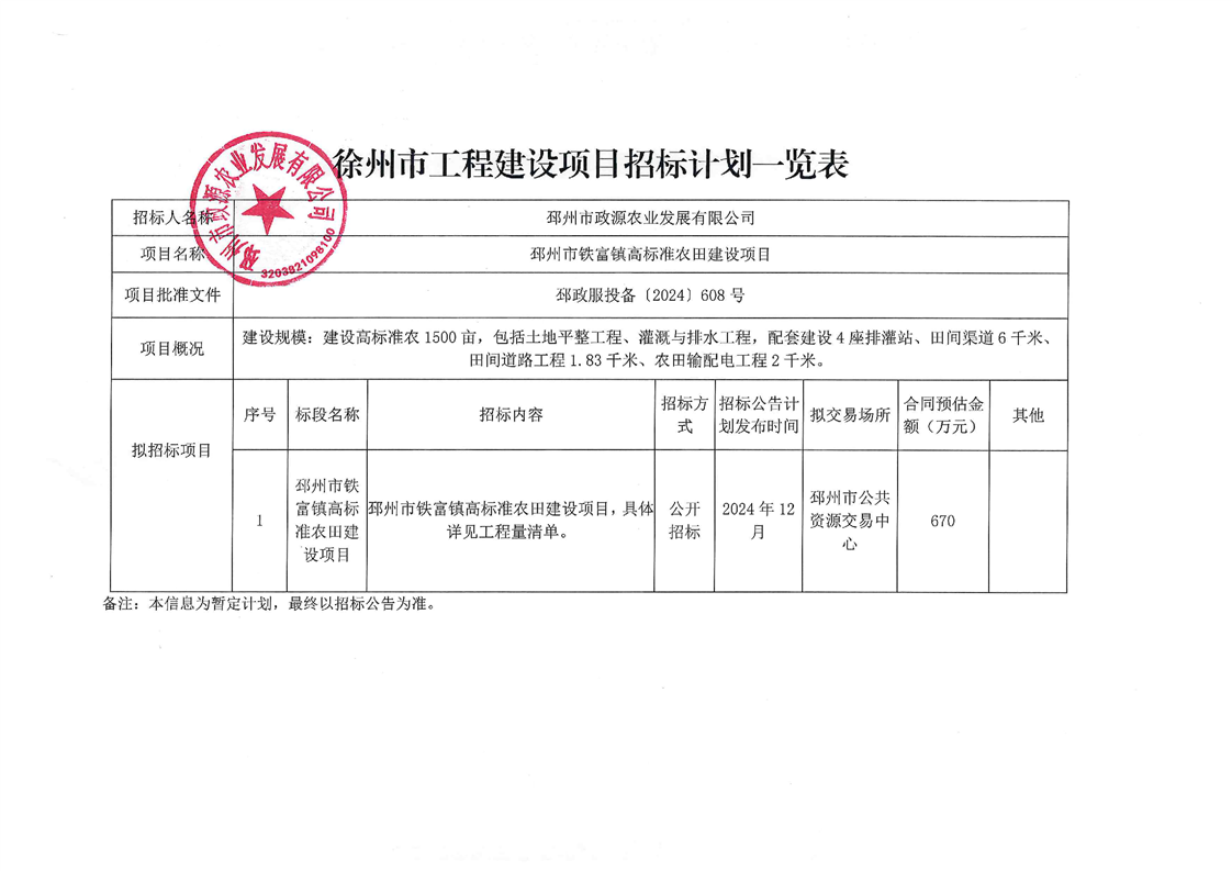 邳州市铁富镇高标准农田建设项目(招标计划)